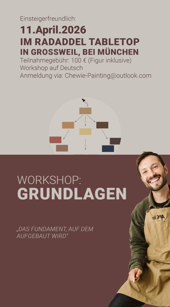 Auswahl der richtigen Pinsel und Farben. Grundtechniken: Basecoating, Layering, Drybrushing, Washes. Grundierung: Spray oder Pinsel, helle vs. dunkle Grundierung. Verständnis von Kontrast und Lesbarkeit auf dem Spielfeld. Etwas Farbtheorie & der richtige Einsatz von Wasser und Nasspalette.