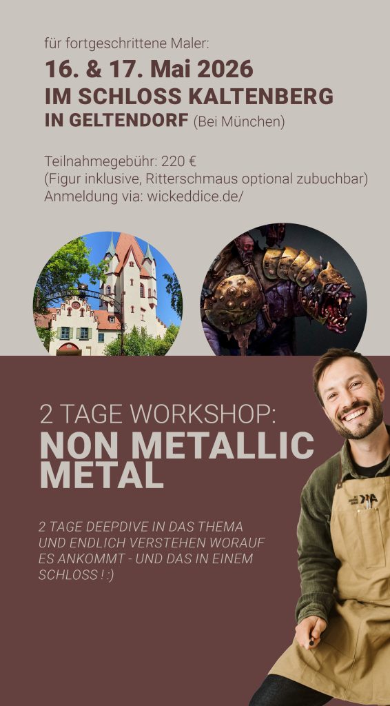 Wir werden uns in das Thema Non-Metallic Metal eintauchen – also Metall malen, ohne Metallic-Farben zu nutzen. Ich beginne mit Theorie und einer kleinen Übung zum „Warmwerden“. Es wird eine „Sacrifice“-Figur geben, an der ihr testen und ausprobieren könnt.