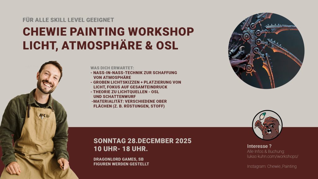 Ich bin hauptberuflich Künstler und fokussiere mich auf das Unterrichten über Patreon sowie auf Auftragsmalerei. Ich habe unglaublich viel Begeisterung für dieses Hobby und teile diese Leidenschaft gerne in Live-Workshops. Dabei helfe ich euch, bessere Maler*innen zu werden – und vor allem dabei, Spaß am Malen zu haben. Egal ob ihr eure Armeen fürs Spielen fertigstellen oder an Malwettbewerben teilnehmen möchtet. Meine Workshops können auf Deutsch, Englisch oder einer Mischung aus beidem stattfinden.