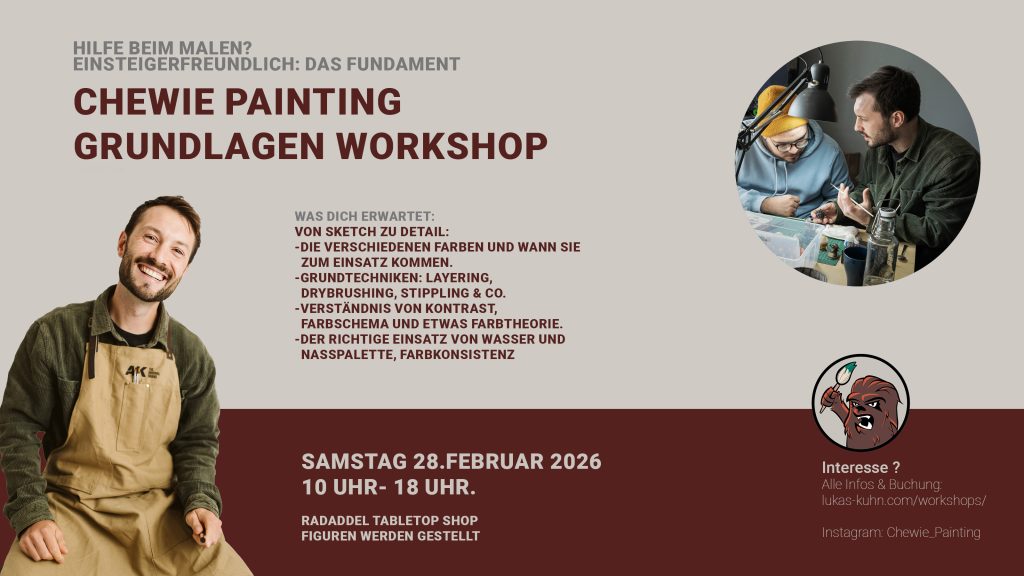Auswahl der richtigen Pinsel und Farben. Grundtechniken: Basecoating, Layering, Drybrushing, Washes. Grundierung: Spray oder Pinsel, helle vs. dunkle Grundierung. Verständnis von Kontrast und Lesbarkeit auf dem Spielfeld. Etwas Farbtheorie & der richtige Einsatz von Wasser und Nasspalette.